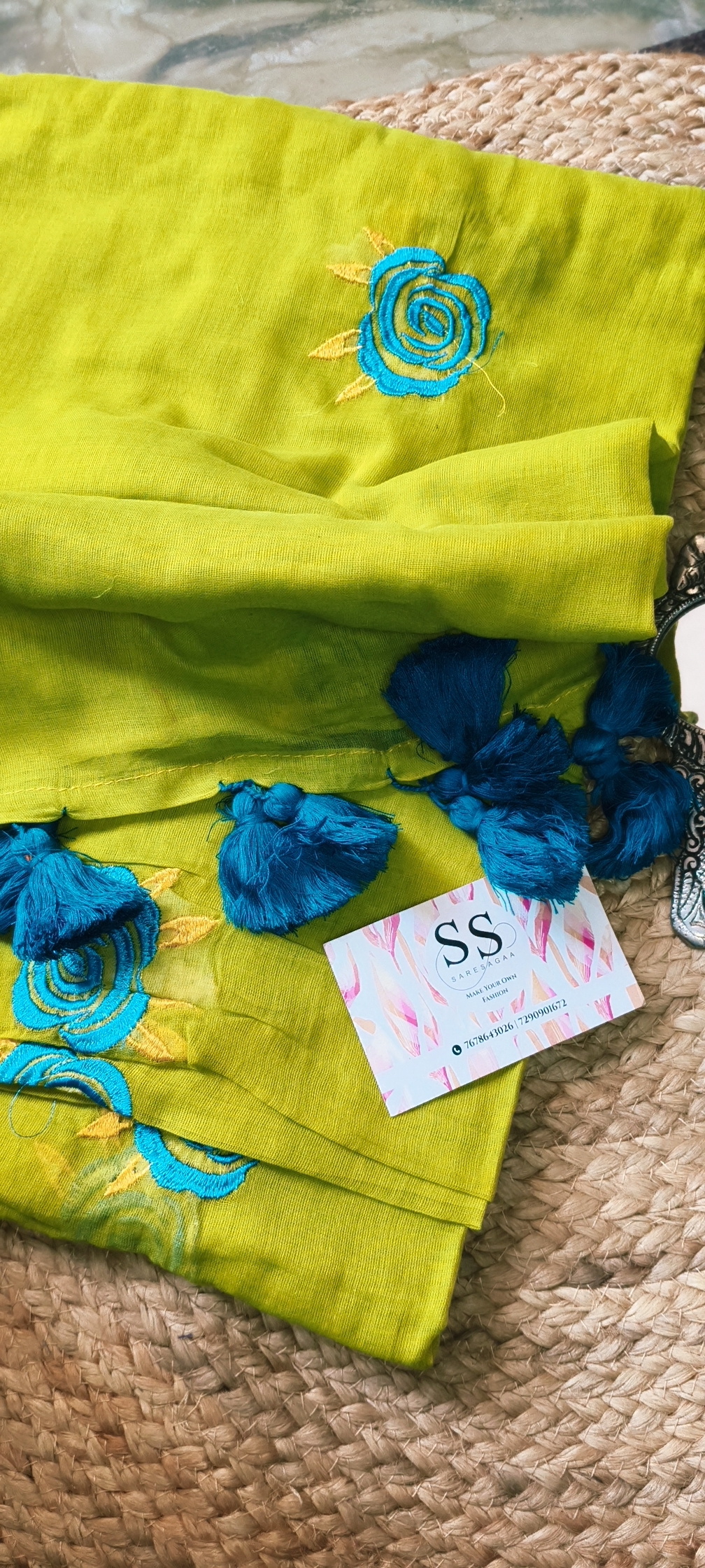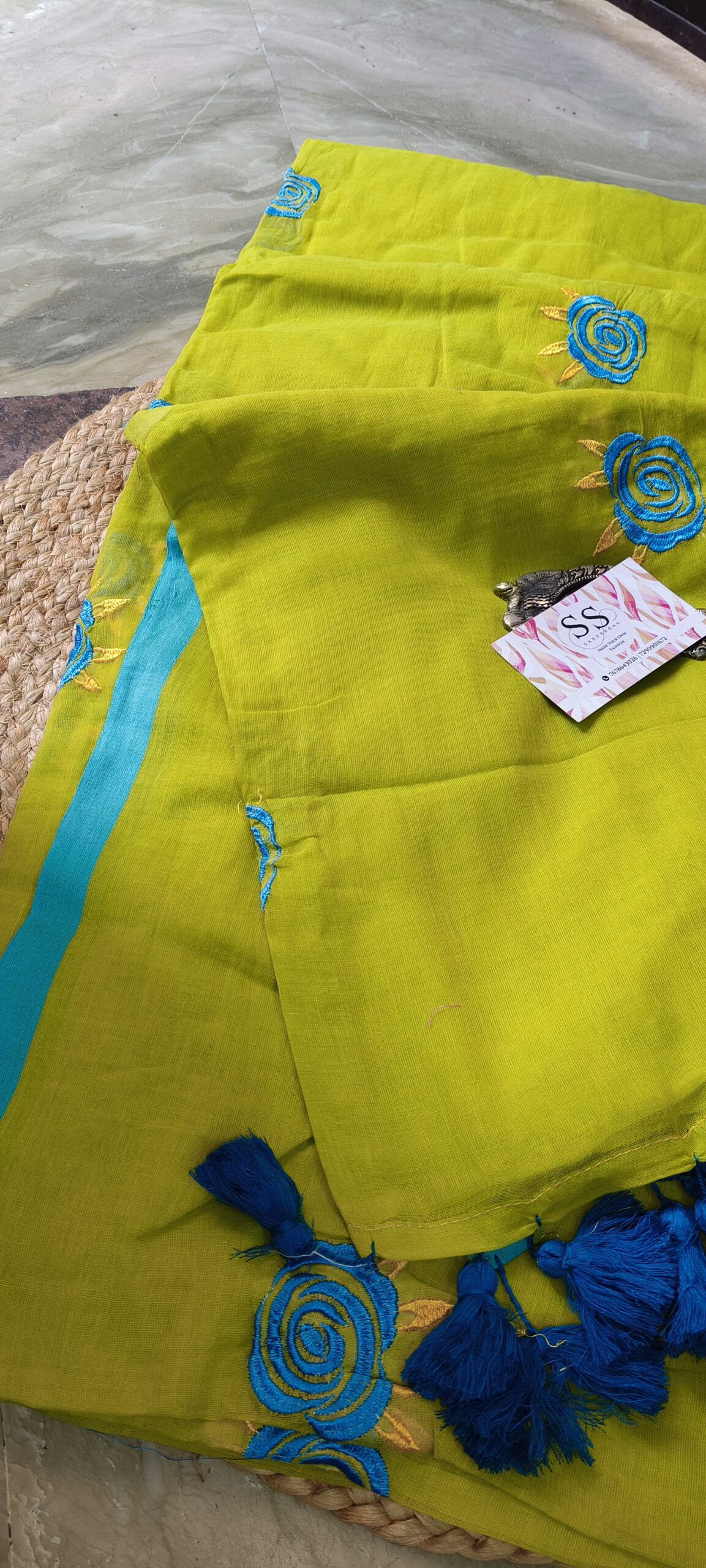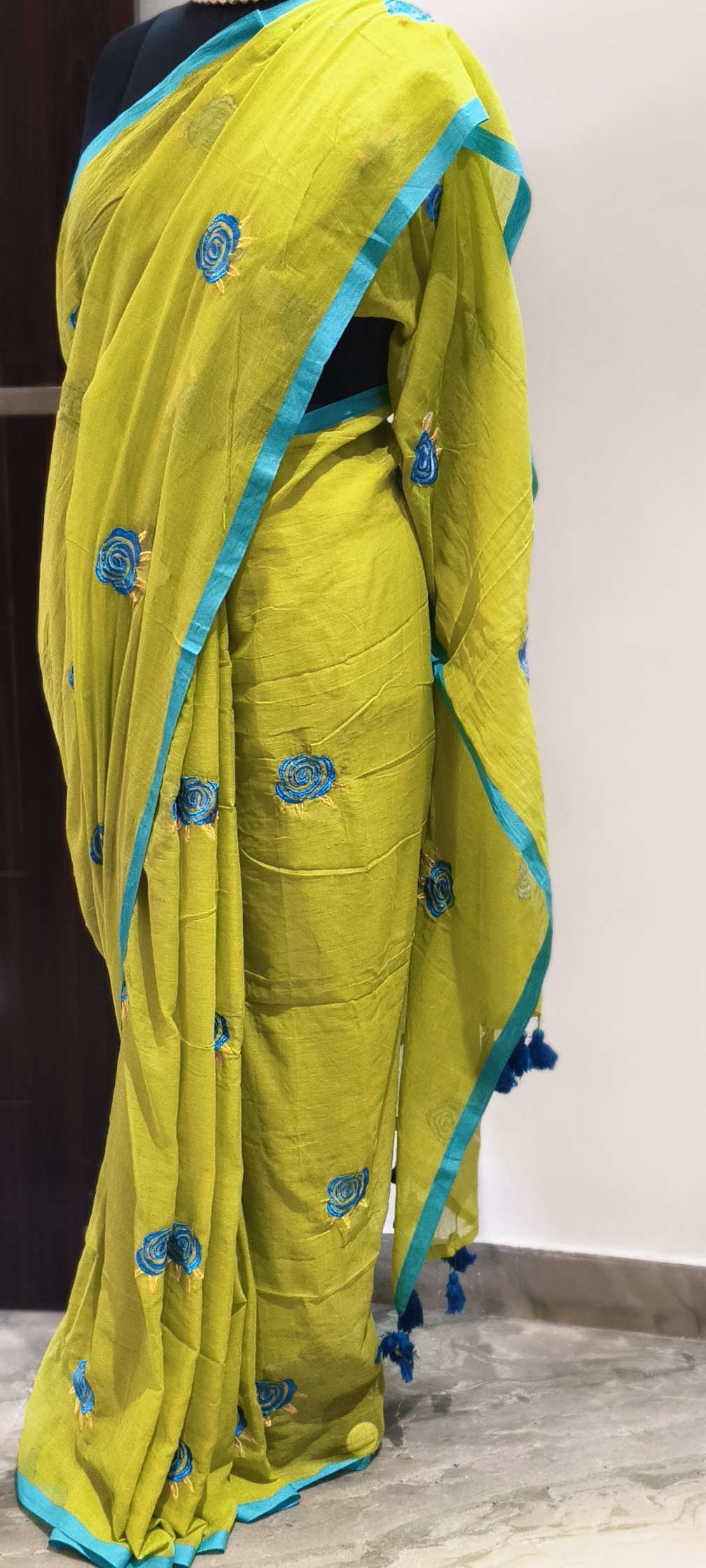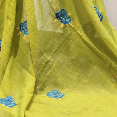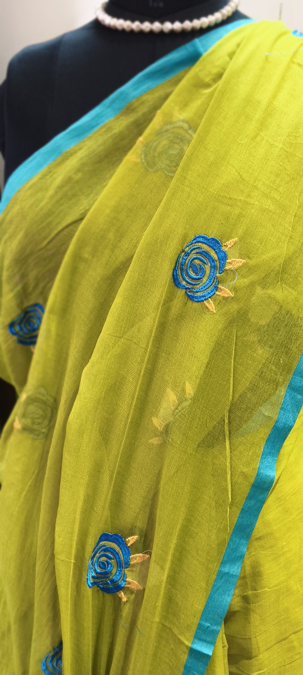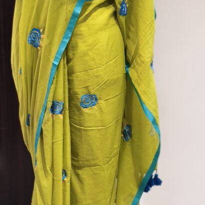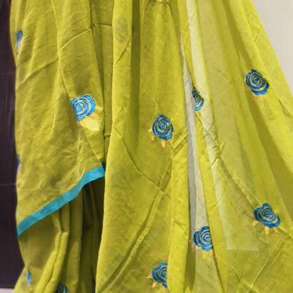 Rose Embroidery: The saree is adorned with delicate, circular rose motifs embroidered in a rich teal blue. The “swirl” pattern of the roses adds a contemporary, artistic touch.