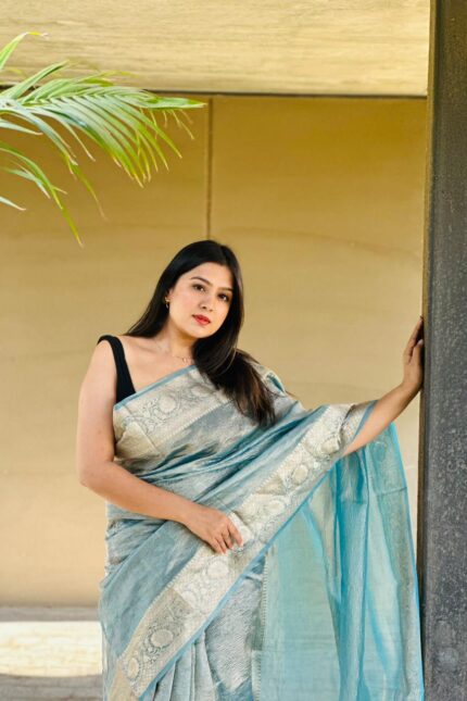 The saree is adorned with intricate Banarasi weaving, showcasing traditional craftsmanship in every detail.