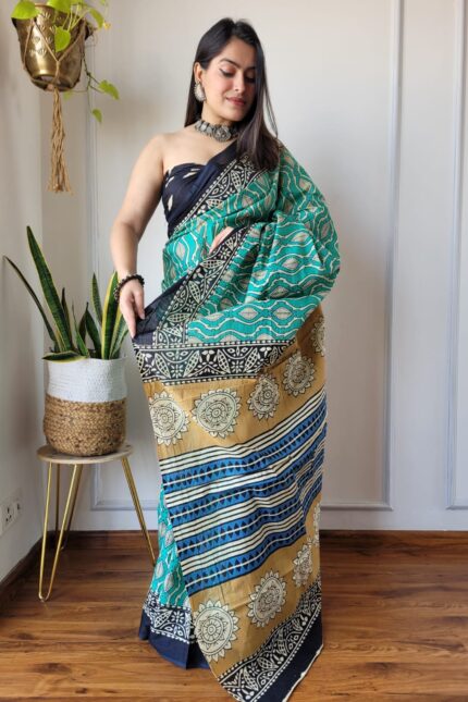 It’s beautiful hand blocked pure cotton mulmul 5.5m saree drape with exclusive 90cm blouse to go with❤️