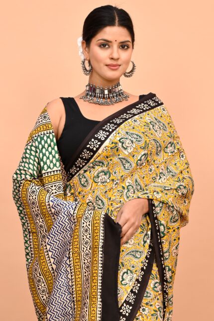 The saree’s lightweight drape ensures comfort while the bold, colorful patterns add a touch of cultural charm.