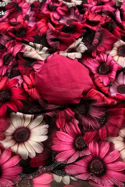 The lightweight and flowy texture of the Italian-printed crepe silk ensures a comfortable drape, making this saree ideal for both casual outings and formal events.