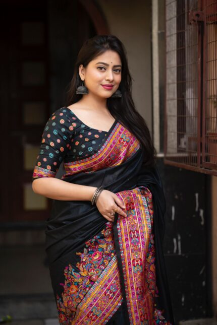 Crafted from premium crepe silk, this saree features intricate Tilla embroidery, a hallmark of Kashmiri artistry.