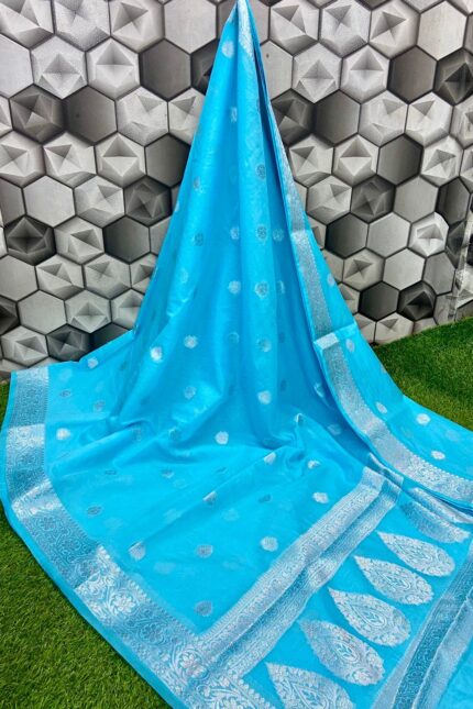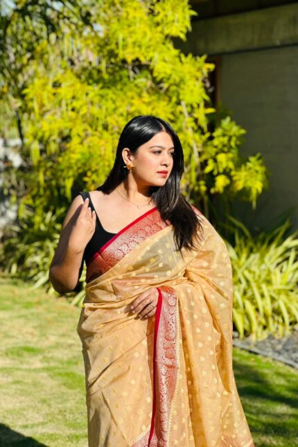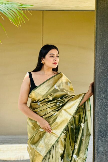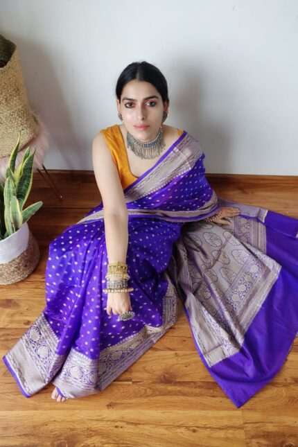 The saree showcases detailed Banarasi zari buttas spread all over it, adding a touch of opulence and tradition to its exquisite design.