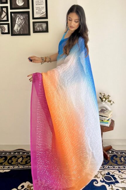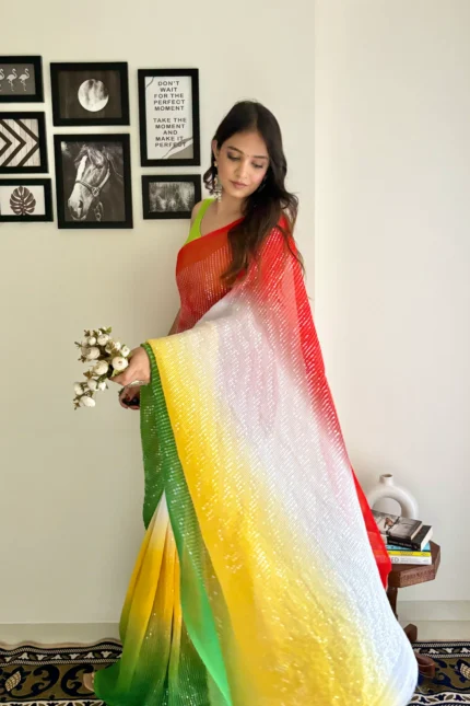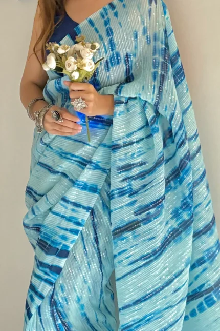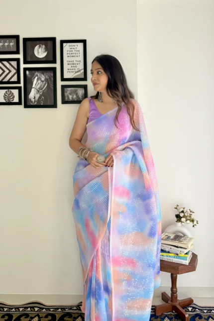 this saree combines the lightness of georgette with the shimmer of sequins, making it an ideal pick for both day and evening events.