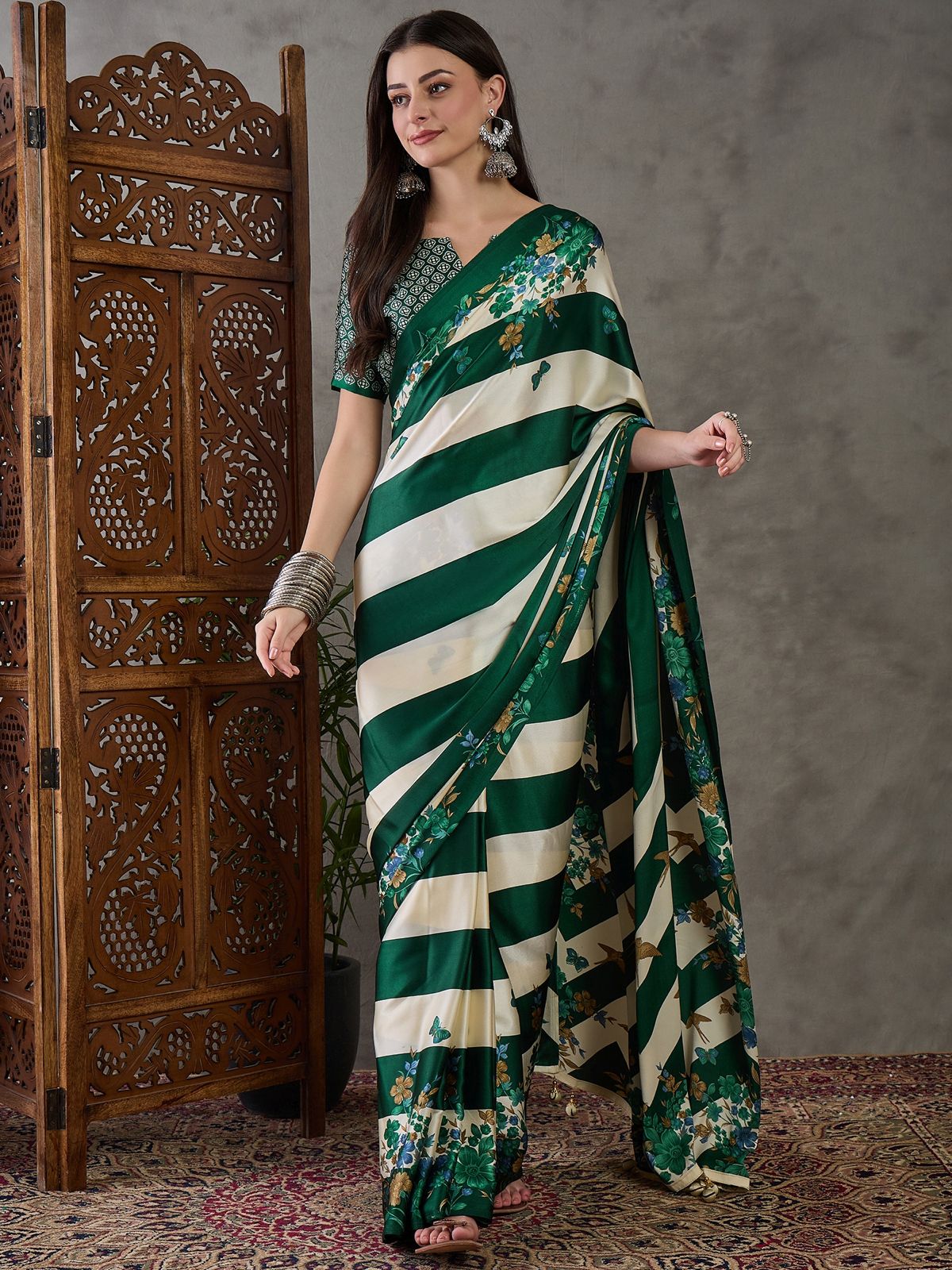 | Satin silk | Black Cream Striped Floral Saree, Bottle Green Cream Striped Floral Saree, Mustard Yellow Cream Striped Floral Saree, Red Cream Striped Floral Saree, Teal Green Cream Striped Floral Saree, Wine Cream Striped Floral Saree |