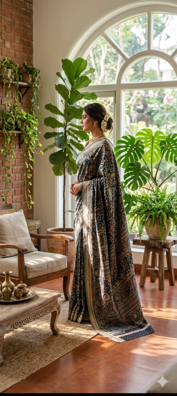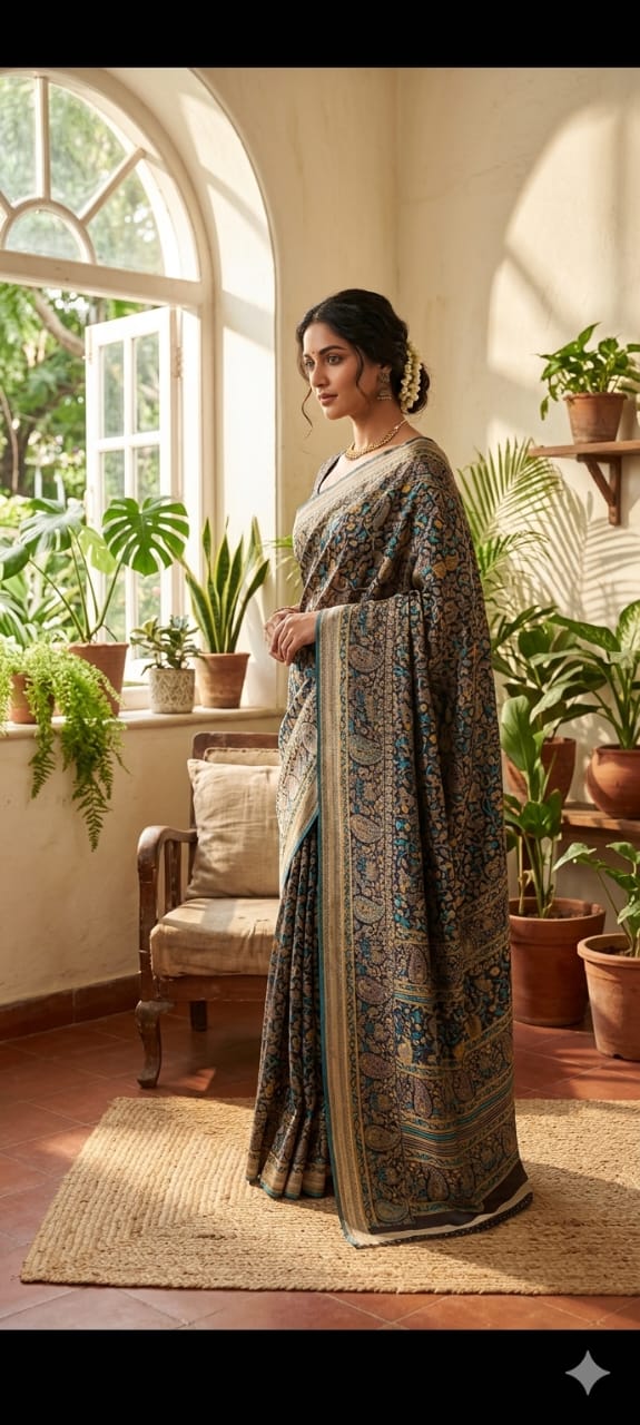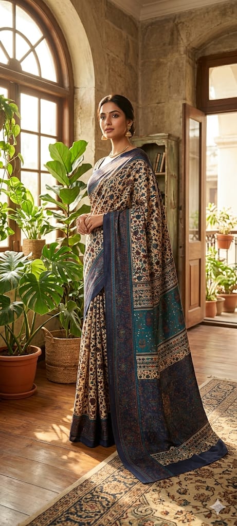 - The all-over Kashmiri Kani print showcases intricate traditional motifs inspired by rich Kashmiri heritage, giving the saree a graceful and artistic appeal.